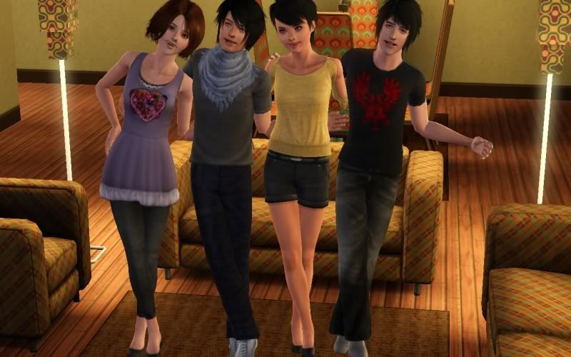 Flickr has a lame 200 photo limit, that sucks. So, I switched backed to photobucket and I remember why I hate it. First, the picture quality is crap and second, it ALWAYS freezes uploading my favorite picture in a set. Not even kidding, the picture is chosen in the middle and it skips over it. Then it freezes at the end, freezes my browser and plays annoying ads with sound that I can't mute. Ugh. And I was having some graphic issues with a CC hair. It worked fine for my teen Morty, but I put it on my new sim, Carwin, and the bangs get all pixelated in game, but not CAS. I feel like it's because of Bridgeport, that city kind of stresses my game out, so I might have to move them to the lovely Altair Cay. I took a few pictures when I wasn't being pissed off at the jacked up hair and photobucket, what a craptastic simming session. New sims are Carwin and Jackyl, they're fraternal twins and they're joining Aaron and Cleo's band.