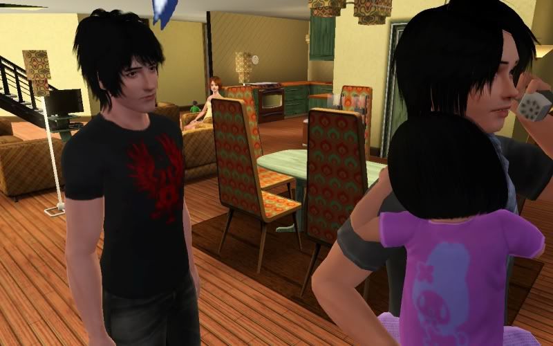 Here is where things got dramatic. Apparently, while I had Dante and Kate live alone for a bit, Mortimer was out CHEATING on poor Kate. I had no idea, she had no idea. They just got married and had two kids before she even found out. Right after she got home from work she ran up and accused him of cheating then talked with Cho on the phone for the longest time. I'm trying to resolve it, but she still refuses to be romantic with him. And then the house phone rings and Dante answers, bursts out laughing(Oh, evil sims) and I get the pop-up that Gunther just died. Karma is indeed a bitch, Morty.